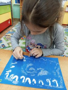 Ребята подготовительной группы на занятии по рисованию превратились в Дедов Морозов и нарисовали зимние узоры на окнах в нетрадиционной технике рисования с помощью искусственного снега и ватных палочек.